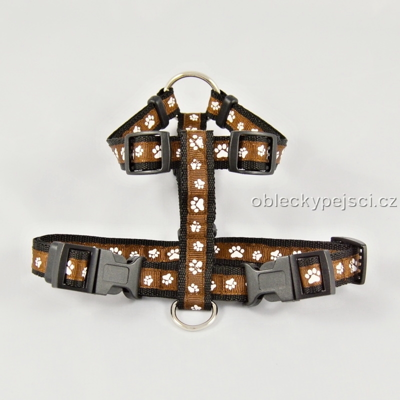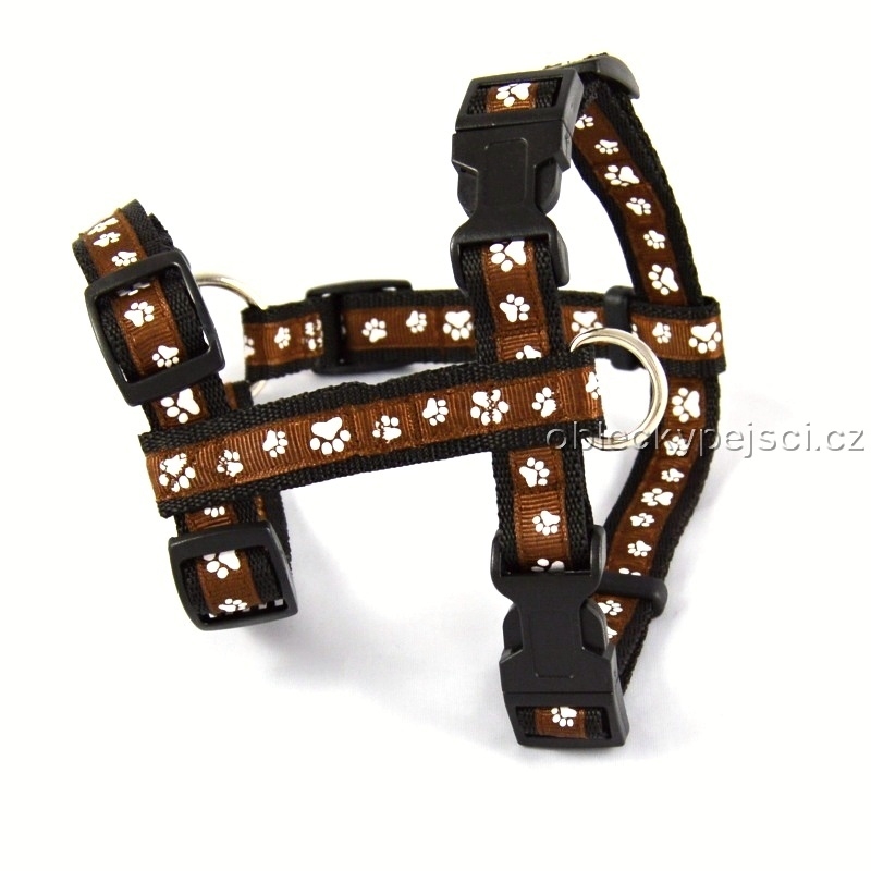 Nylonové kšíry jsou ušité z polypropylénové popruhu s našitou hnědou rypsovou stuhou s motivem bílých tlapek. Obvod krku i hrudi si nastavíte dle potřeby vašeho pejska, zapínají se na pevné plastové spony - trojzubce. Kšíry se oblékají přes hlavičku pejska a poté jednoduše zapnou na zádech pomocí trojzubců.