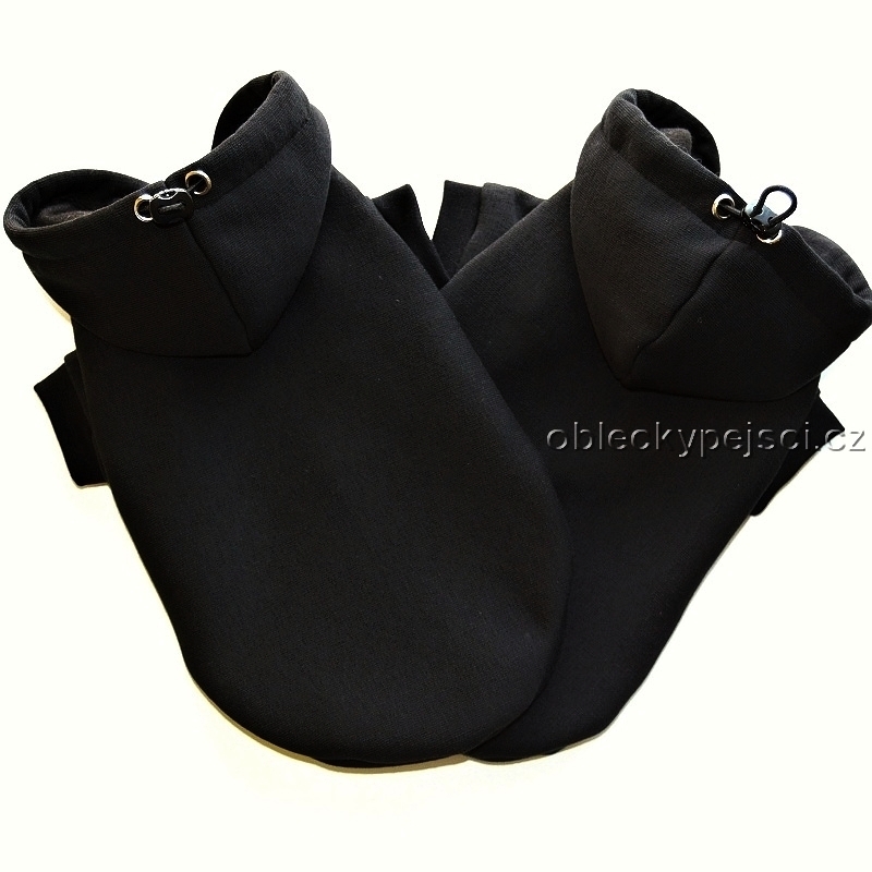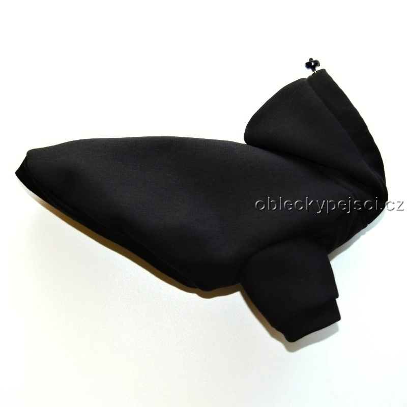 Teplá, černá mikina je ušitá z velmi měkké, příjemné počesané teplákoviny a je ideální do chladných jarních, podzimních a zimních dnů. Pod kapucí je otvor pro připnutí vodítka k obojku, a také je v kapuci protažená gumička na stažení dle potřeby. Tato mikina díky našitým černým nápletům v délce a rukávkách dobře drží na těle pejska, v délce je přišitá gumička na případné provlečení ocásku. Mikina se jednoduše zapíná pomocí suchých zipů na bříšku. Jelikož je mikina jednobarevná a tentokrát bez ozdob, můžete si jí sami dozdobit např. nažehlovačkou dle svého oblíbeného motivu.