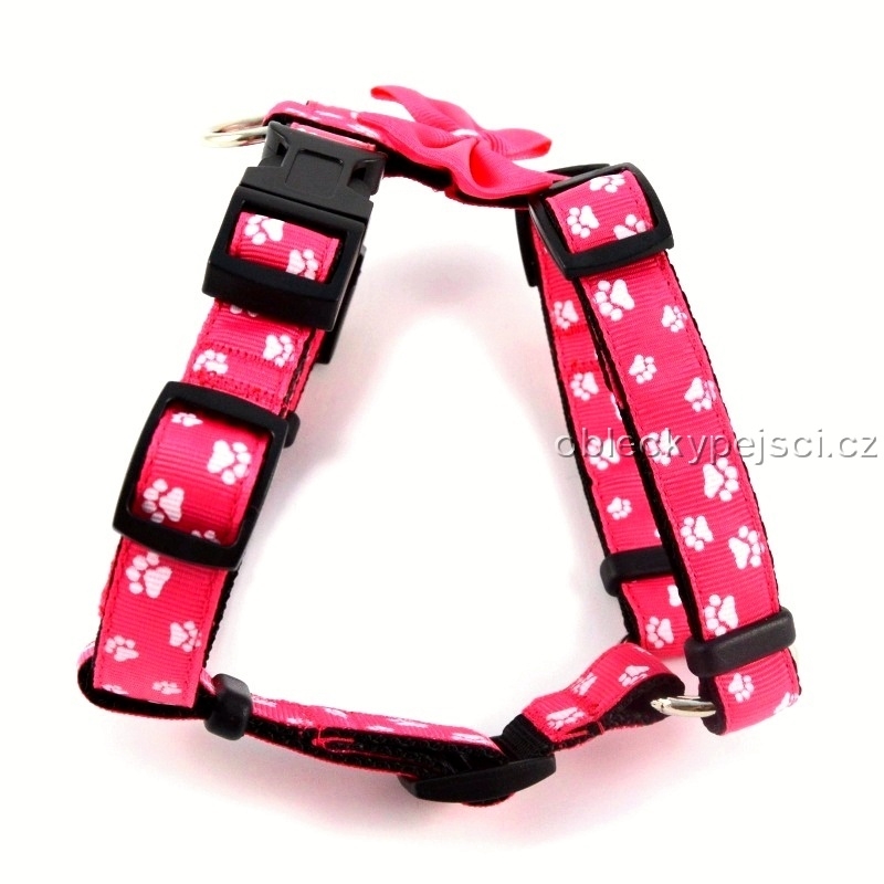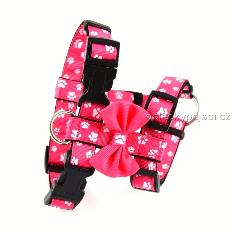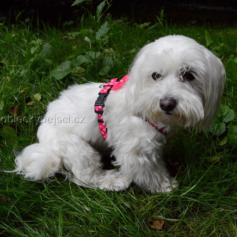 Nylonové kšíry jsou ušité z měkkého, polypropylénové popruhu s našitou růžovou rypsovou stuhou s motivem bílých tlapiček. Obvod krku i hrudi si nastavíte dle potřeby vašeho pejska, zapínají se na pevné plastové spony - trojzubce. Kšíry se oblékají přes hlavičku pejska a poté jednoduše zapnou na zádech pomocí trojzubců.