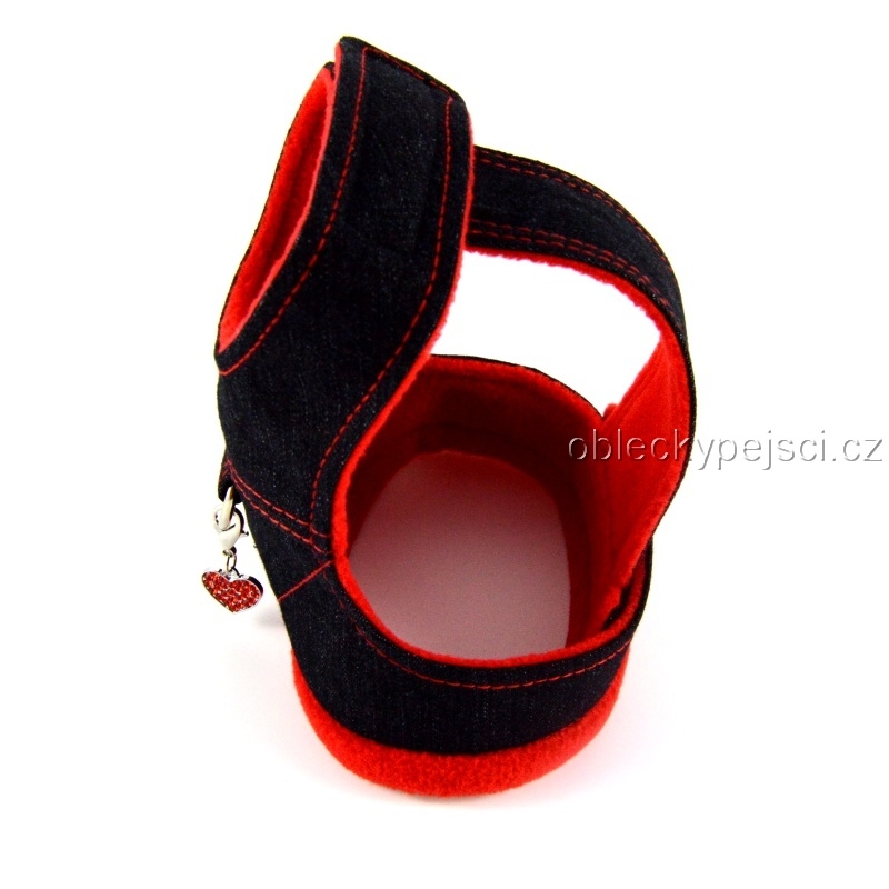 Džínové, zateplené kšíry s krásným, červeným přívěskem s kamínky ve tvaru srdíčka jsou ideální pro pejsky i fenečky co hledají maximální pohodlí do jarních a podzimních dnů.