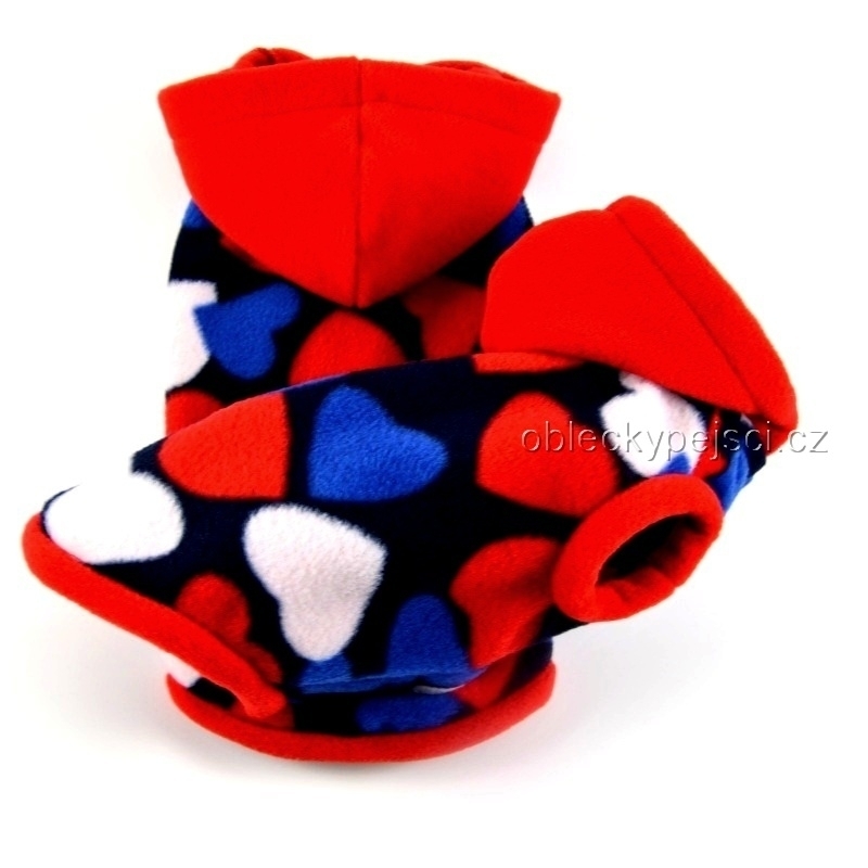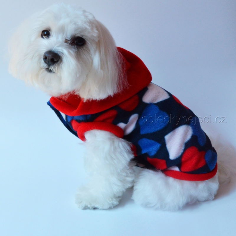 Roztomilá, mikina bez rukávů je ušitá z měkkého, slabšího fleece plného srdíček bílých, červených a modrých na temně modrém podkladu. Kapuca, olemování průramků a délky je z červeného fleece. Pod kapucí má otvor pro připnutí vodítka k obojku. V délce nemá gumičku na ocásek.