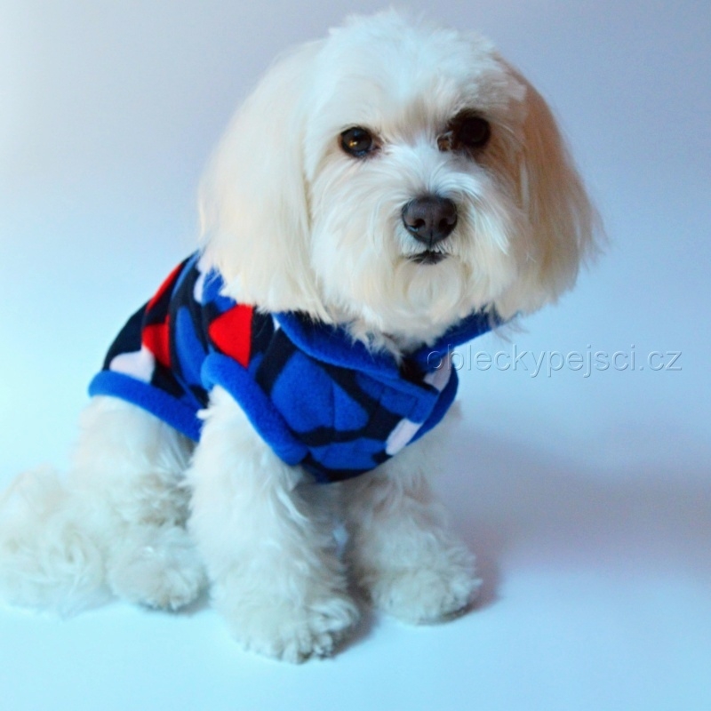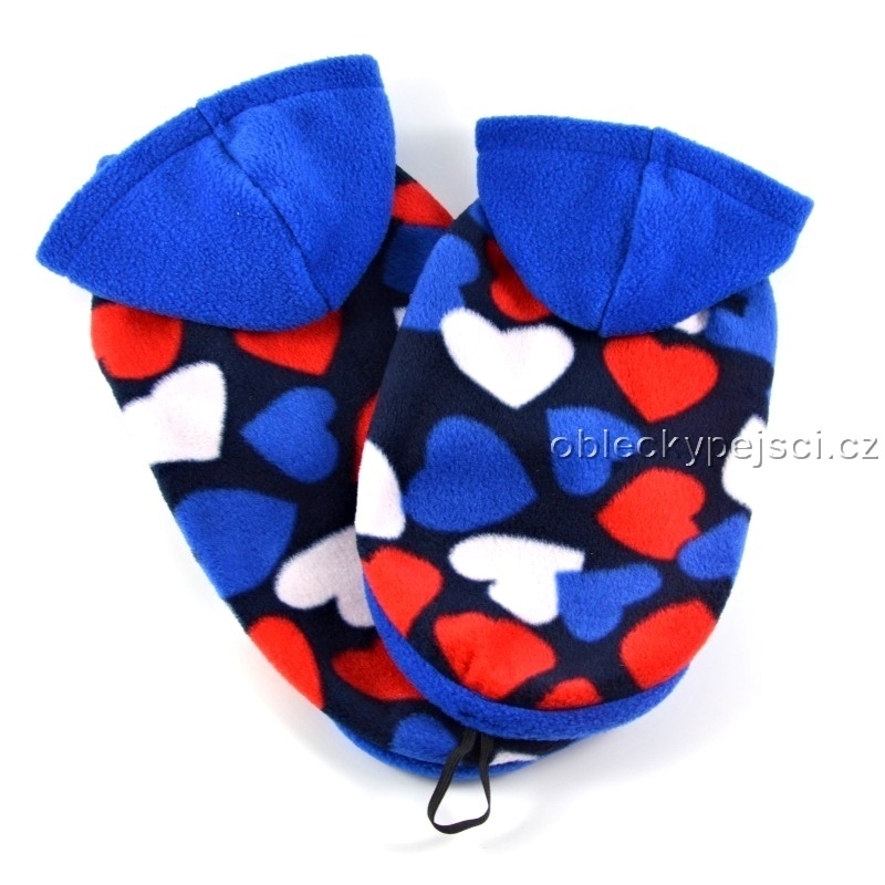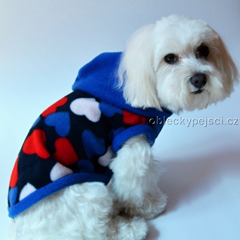 Roztomilá, mikina bez rukávů je ušitá z měkkého, slabšího fleece plného srdíček bílých, červených a modrých na temně modrém podkladu. Kapuca, olemování průramků a délky je z modrého fleece. Pod kapucí má otvor pro připnutí vodítka k obojku. V délce je přišitá gumička na ocásek.