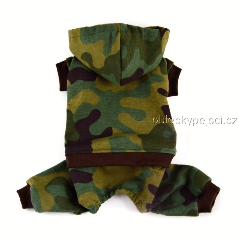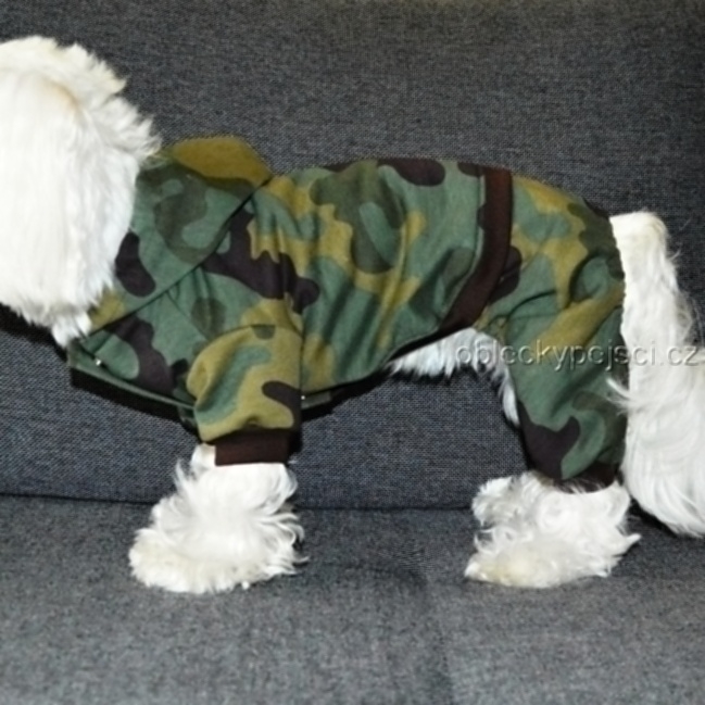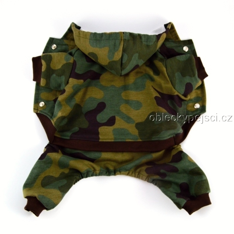 Overal je ušitý z příjemné, bavlněné, nepodčesané teplákoviny s motivem zeleného maskáče. Délka rukávů, zad a nohavic je zakončená hnědými náplety. Overal se zapíná na hrudi pomocí stříbrných baby cvočků. V okrajích nohavic je protažená gumička, aby dobře držely na těle pejska.