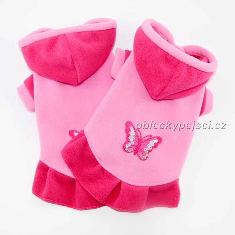 Krásná, růžová mikina je ušitá z měkkého, příjemného microfleece kombinaci sladce růžové a sytě růžové barvy. Záda mikiny zdobí přišitá nažehlovačka ve tvaru motýlka. Délka mikiny je zakončena volánkem.