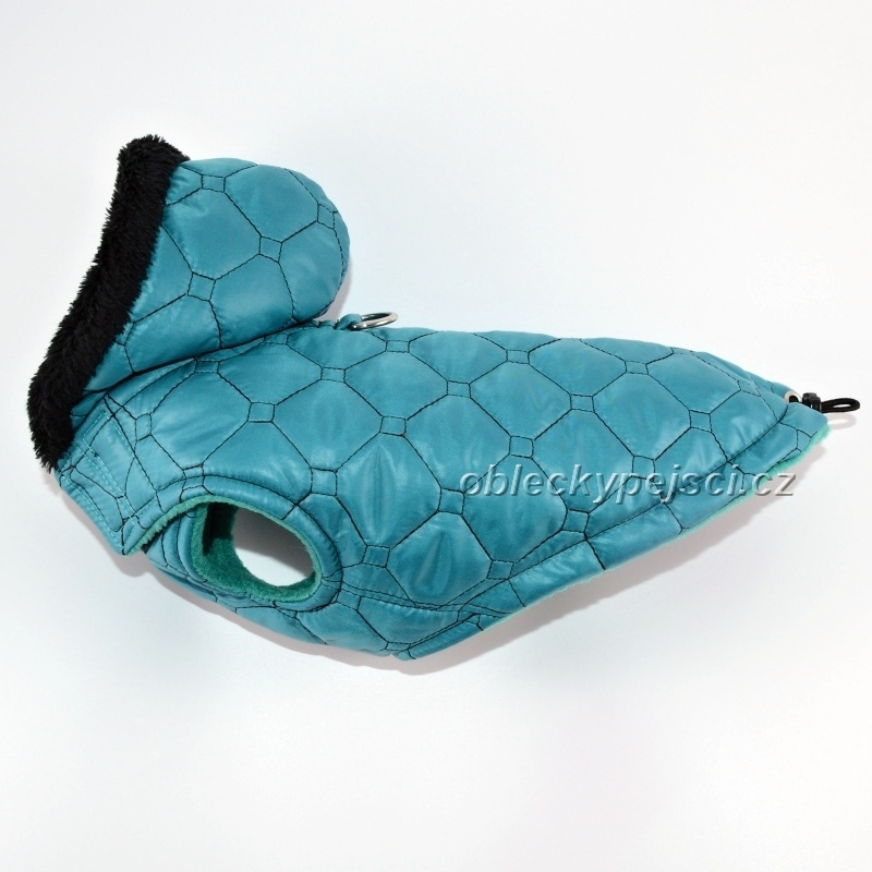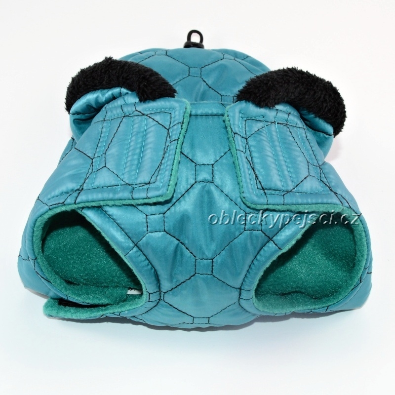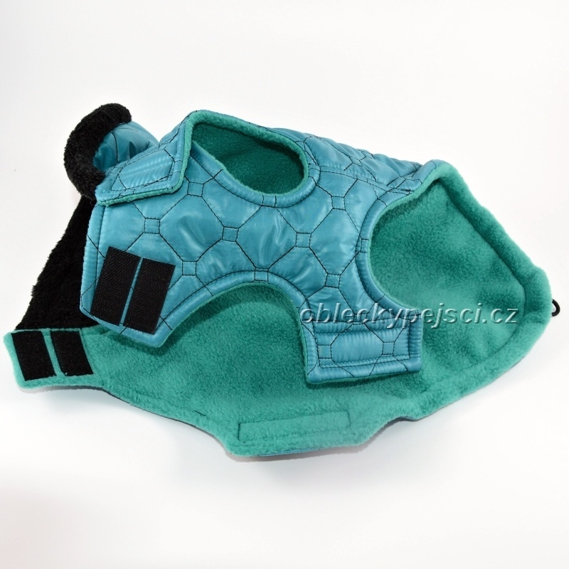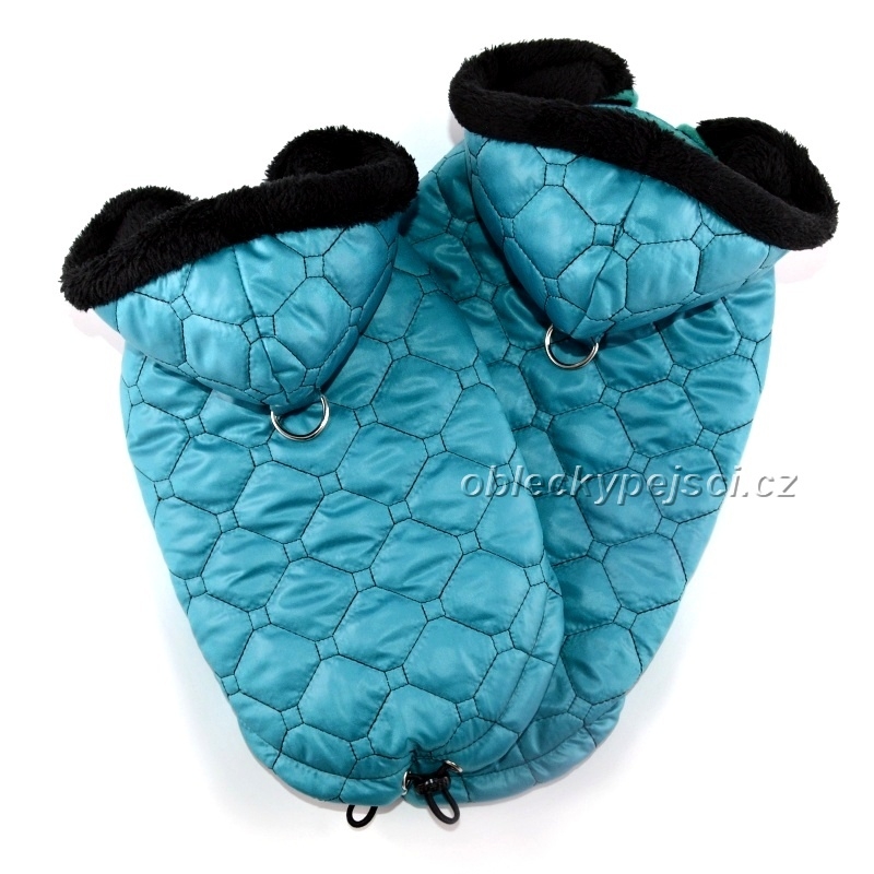 Bunda je ušitá ze slabšího proševu, světle petrolejové barvy, uvnitř je tenký vatelín, vypodšívkovaná teplým, měkkým fleecem. Kapuca je vypodšívkovaná černým, velmi heboučkým fleecem - medvídkem. Na zádech je přišitý polokroužek pro připnutí vodítka. V délce bundy je protažená gumička na stažení, aby bunda dobře seděla seděla na těle pejska.