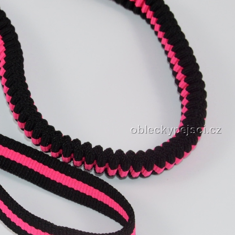 Vodítko je ušité z pevného růžovo - černého popruhu, který má uprostřed všitou gumu, díky ní se stává pružným a dokáže se natáhnout až cca 190cm.