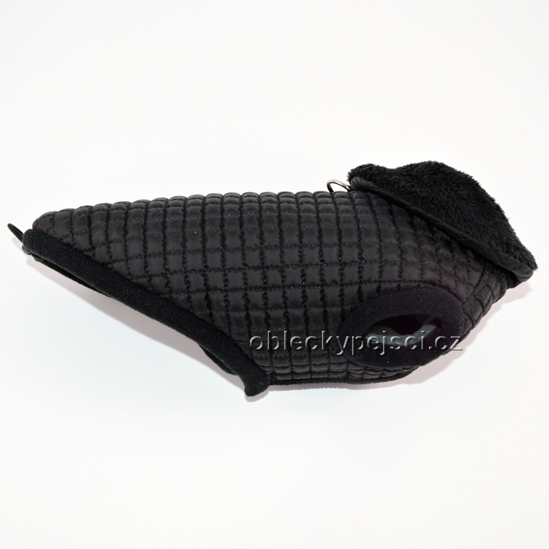 Elegantní límec je ušitý z černého proševu a vrchní díl z měkkého a hebkého fleece s chlupem - medvídkem. Na zádech je přišitý praktický polokroužek pro připnutí vodítka. Olemování průramků a délky je z černého fleece a v délce je protažená gumička na stažení.