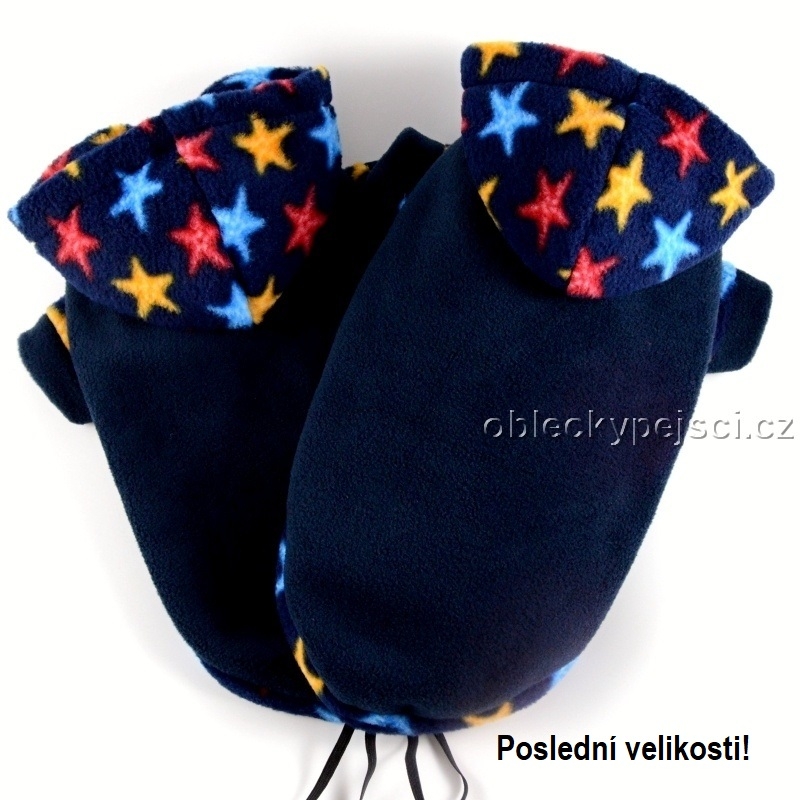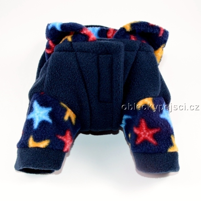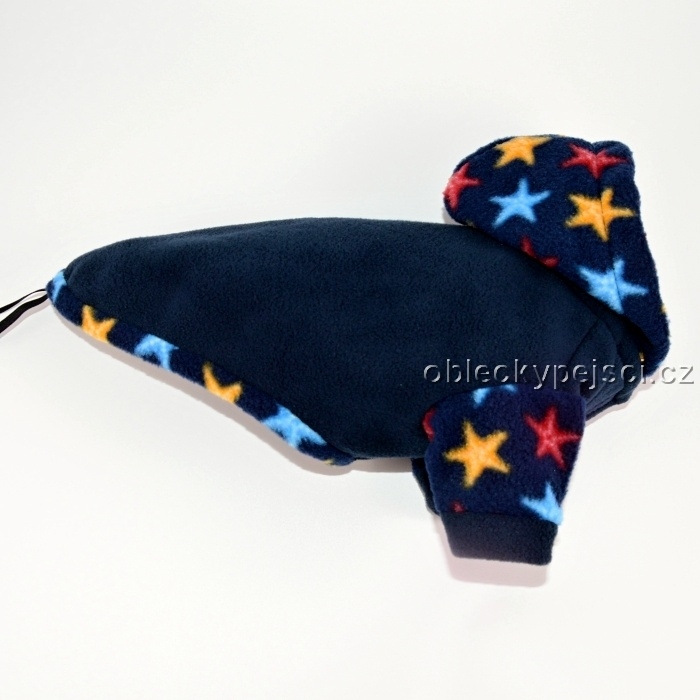 Mikina je ušitá z temně modrého, měkkého, kvalitního fleece v kombinaci modrého fleece s motivem barevných hvězdiček. Pod kapucí je otvor pro připnutí vodítka k obojku.