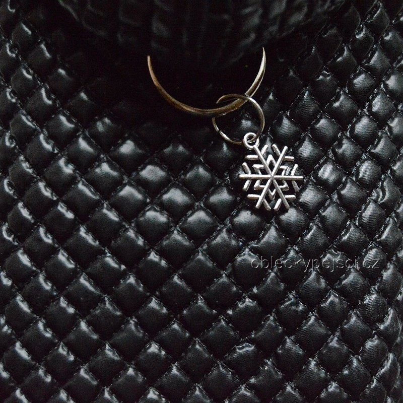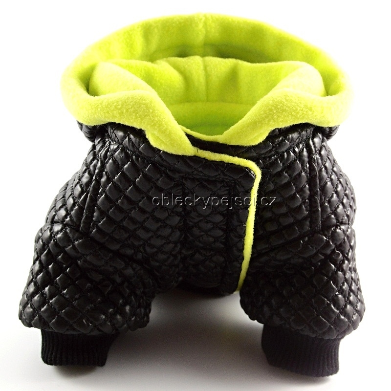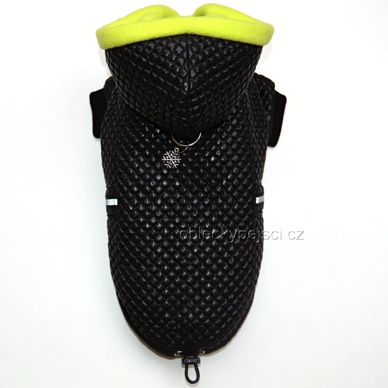 Bunda je ušitá ze slabého, pololesklého, měkkého, černého proševu s motivem malých kostiček, zateplená vatelínem a fosforovým žluto - zeleným teplým, kvalitním fleecem ze kterého je i vypodšívkování kapuce.