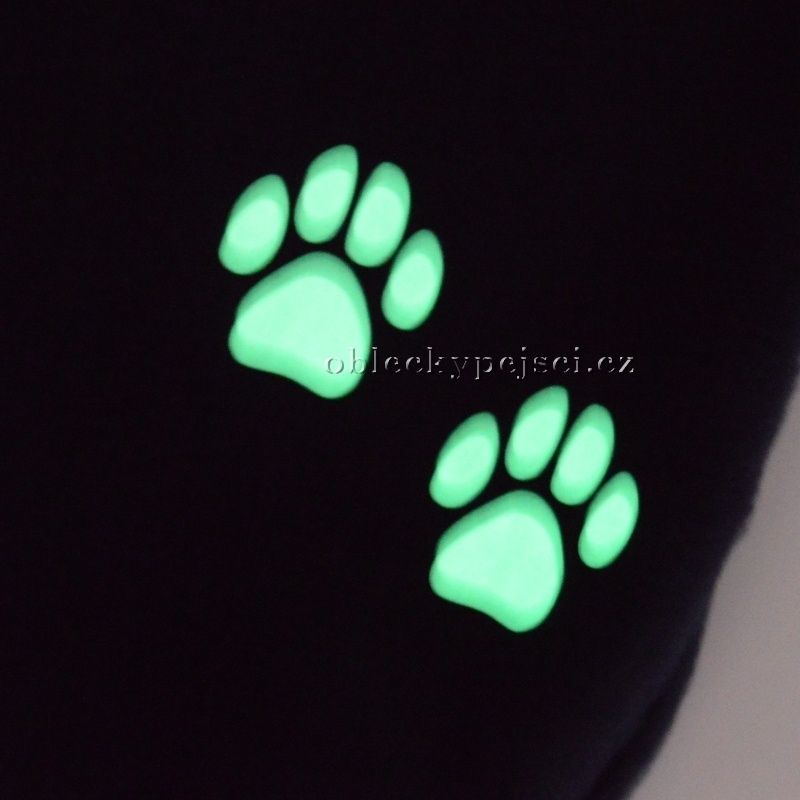 Záda mikiny zdobí dvě tlapičky, které jsou přes den bílé a po nasvícení v noci fosforově svítí. Mikina se zapíná jednoduše na bříšku pomocí suchých zipů. V celé délce je protažená gumička s modrou brzdičkou pro případné stažení. - je také vhodná pro pejsky co nemají ocásek, neboť díky tomuto stažení dobře drží na těle pejska.