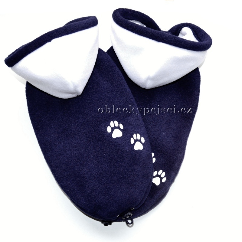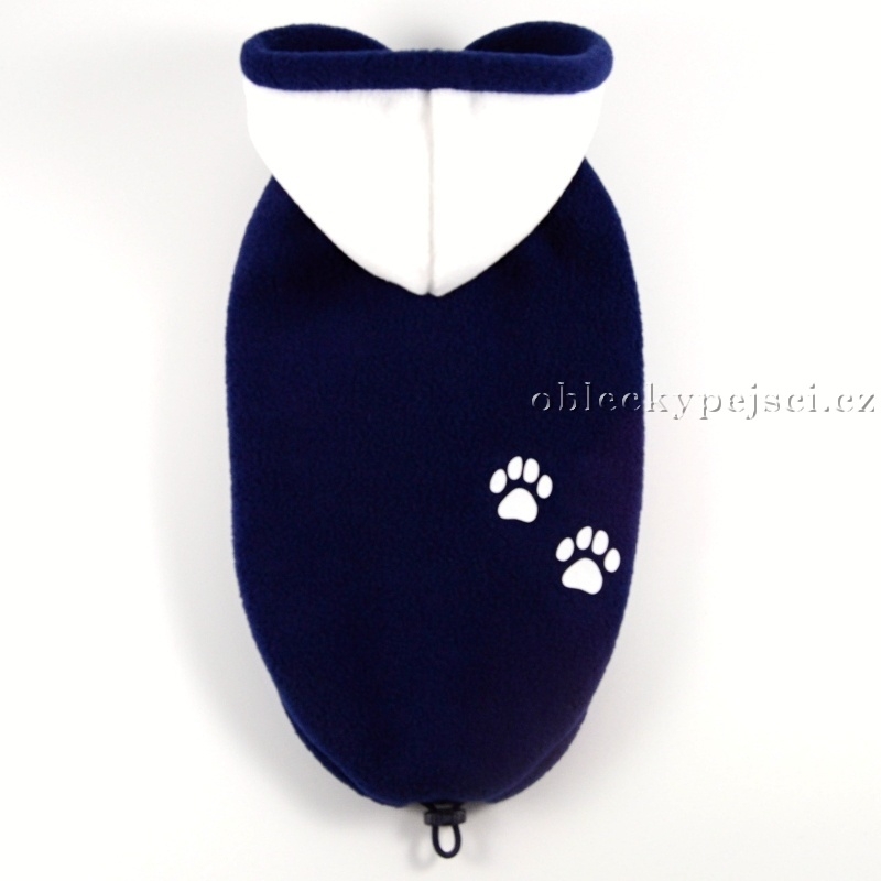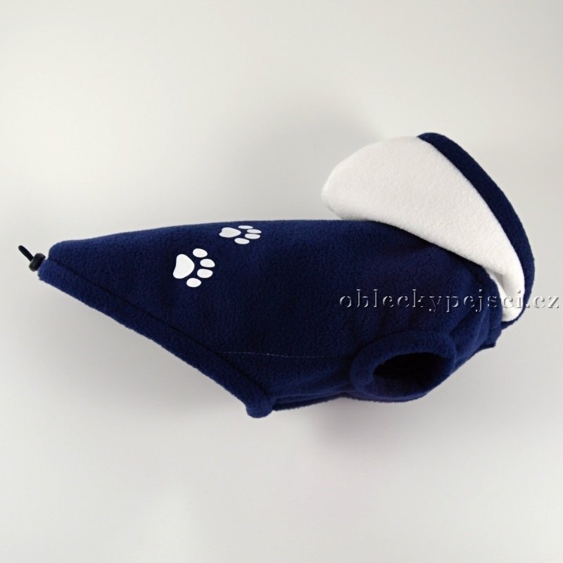 Mikina je ušitá z měkkého, teplého tmavě modrého fleece v kombinaci bílého ,ze kterého je kapuce. Pod kapucí je otvor pro připnutí vodítka k obojku.