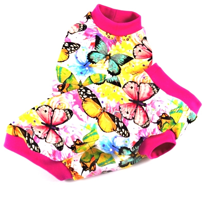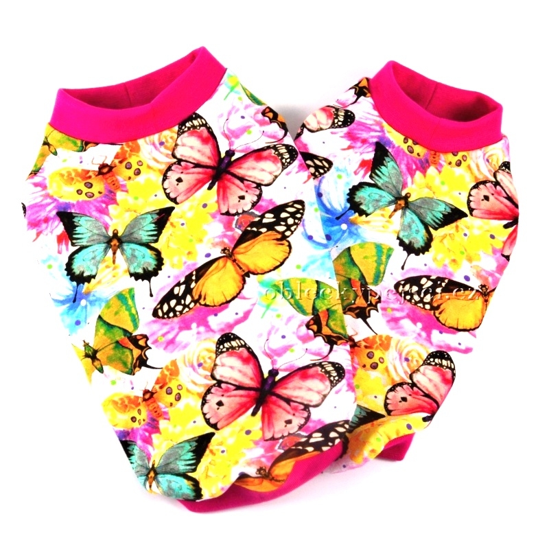Tričko je ušité z krásného, velmi jemného, kvalitního, bavlněného, elastického úpletu s motivem digitálního tisku nádherně barevných motýlků. Krk, délka a průramky jsou zakončeny sytě růžovými náplety. Tričko nemá zapínání, převléká se přes hlavičku pejska.