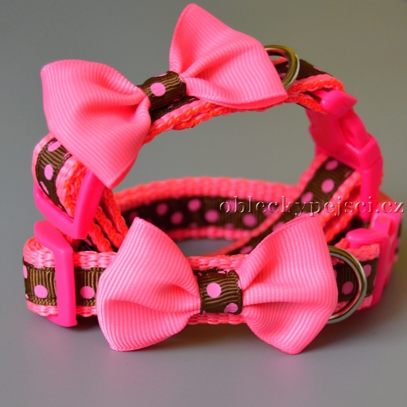 Obojek hnědý s růžovým puntíkem a mašličkou pro všechny psí holky.