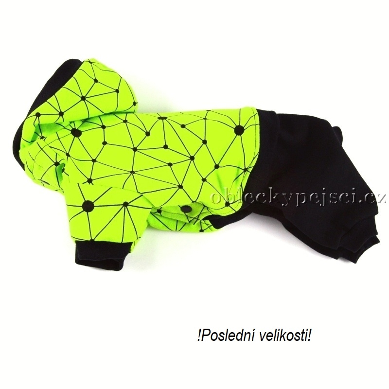 Overal je ušitý z výrazné zeleno - žluté (do neónova), elastické, slabší teplákoviny s černým motivem v kombinaci černé teplákoviny, ze které jsou zadní nohavice overalu.