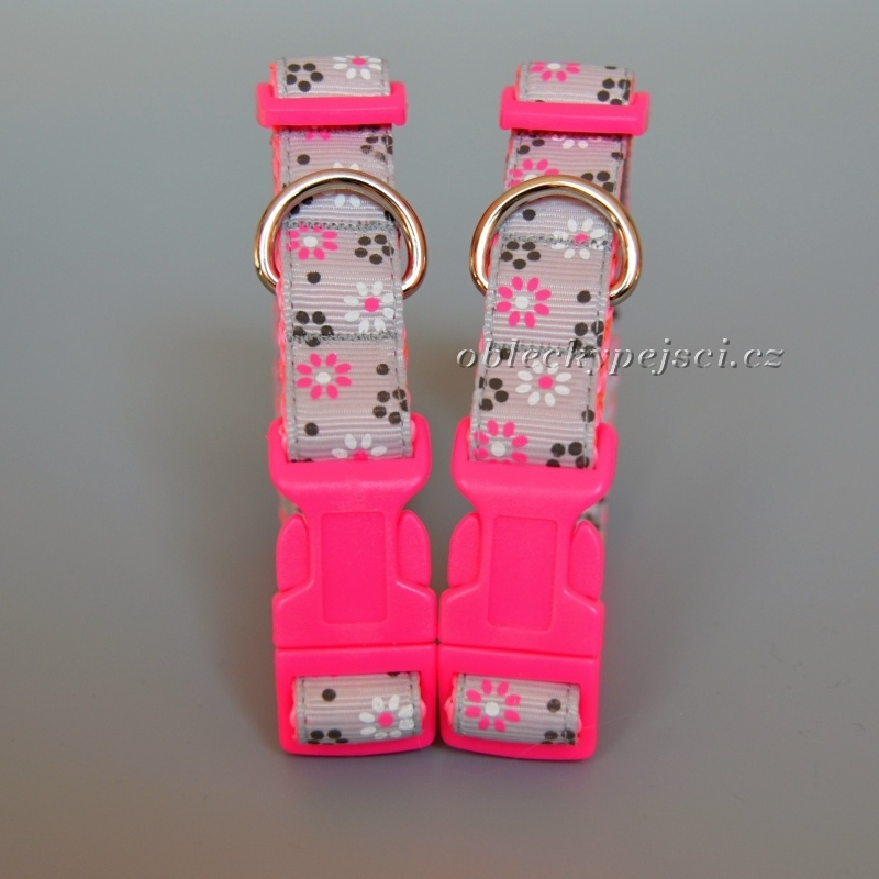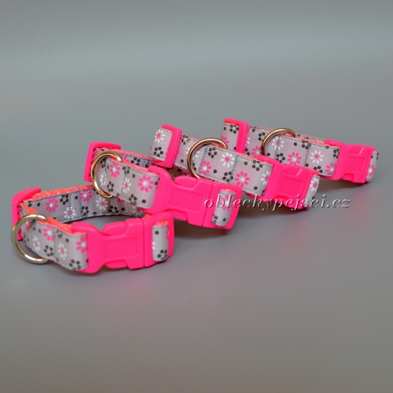 Obojek je ušitý z neónově růžového, pevného, polypropylénového popruhu s našitou kvalitní rypsovou stuhou plnou malých kytiček.