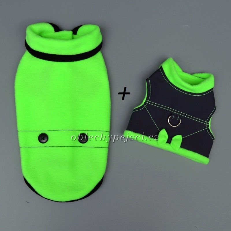 Fleecová svítivě zelená mikina s malým límečkem pro malé psí holky + kšíry s mašličkou