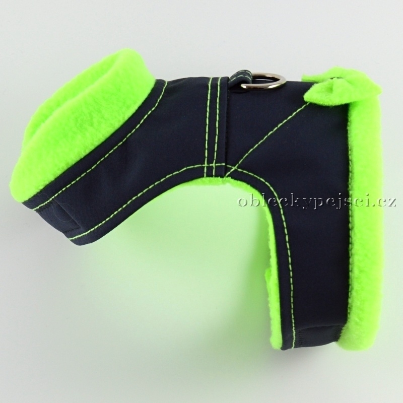 Kšíry jsou ušité z letního tmavě šedého softshellu, vypodšívkované neonově zeleným, zářivým fleecem. Na zádech je všitý polokroužek pro připnutí vodítka a zdobí je přišitá málá mašlička.