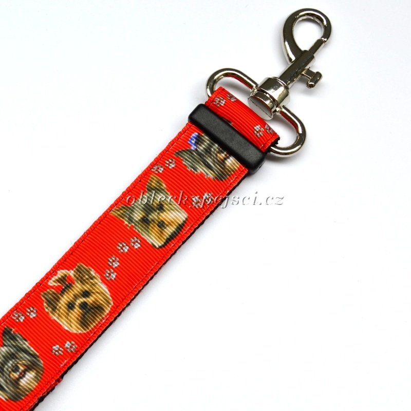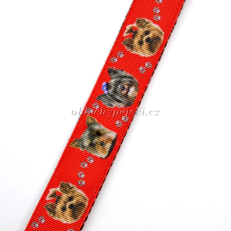 Pás je ušitý z kvalitního, pevného polypropylénového popruhu s našitou hezkou, kvalitní červenou stuhou s yorkshírkami. Délku pásu lze regulovat viz. velikostní tabulka.