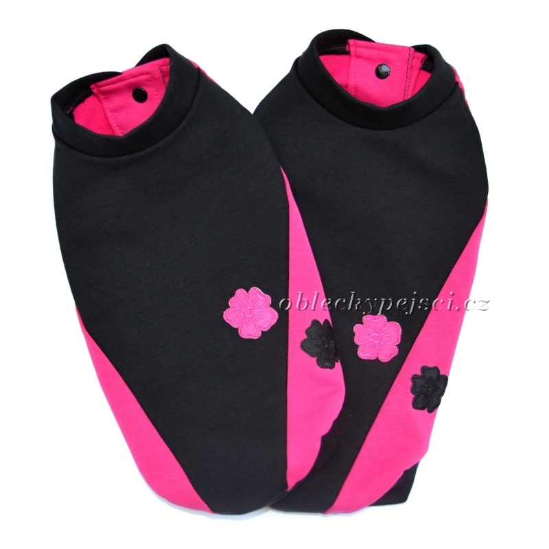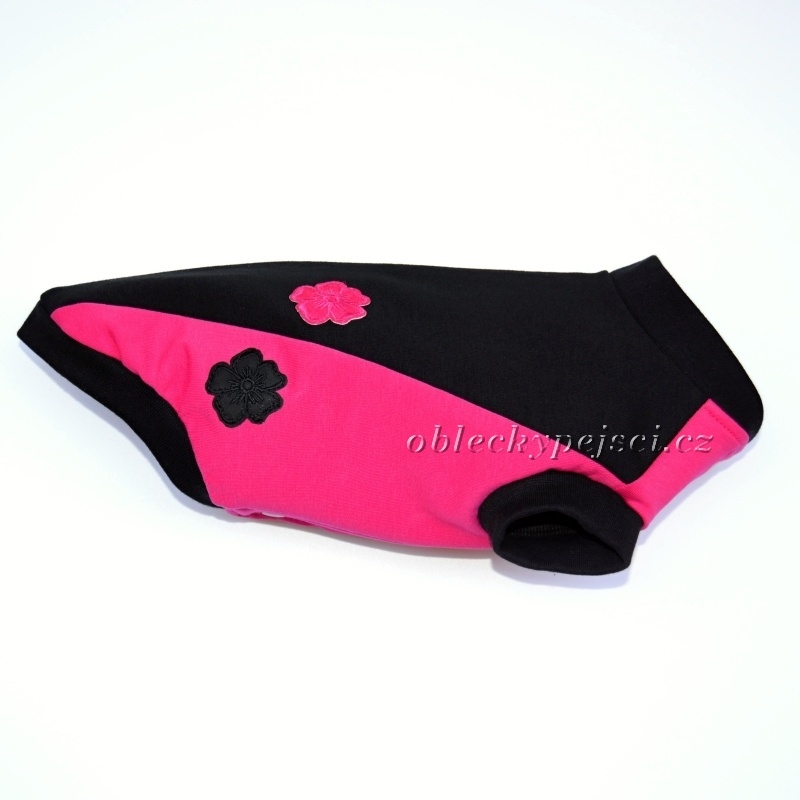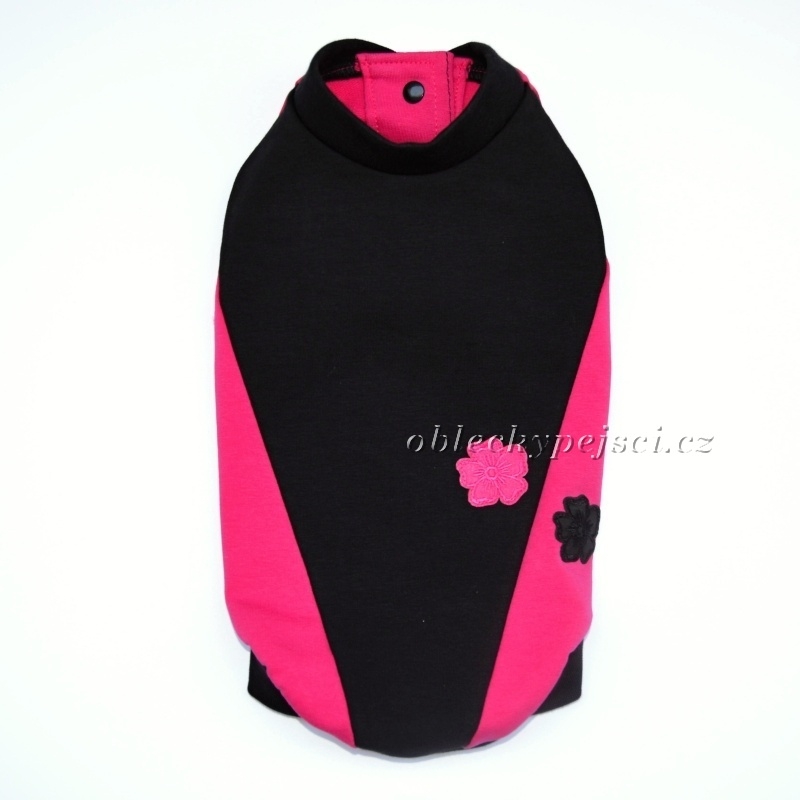 Výrazná mikina je ušitá z kvalitní, sytě růžové a černé slabší, bavlněné, elastické teplákoviny. Stojáček u krku je ušitý z černého nápletu, délka a průramky jsou zakončeny černými náplety.