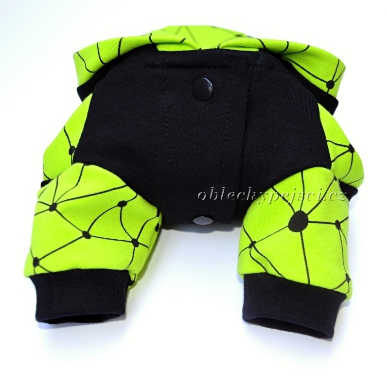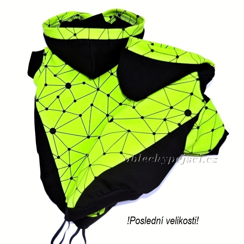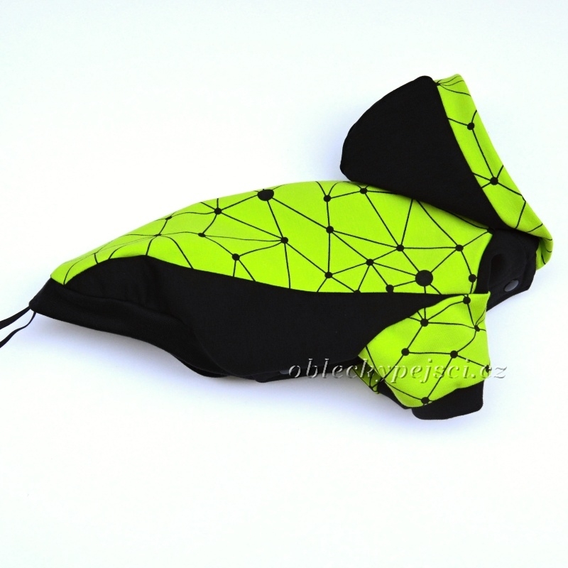 Výrazná mikina je ušitá z kvalitní, bavlněné, elastické, slabší teplákoviny v barvách černé a zeleno - žluté do neonova s geometrickým potiskem v černé barvě. Délka a průramky jsou zakončeny černými, bavlněnými náplety. Pod kapucí je otvor pro připnutí vodítka k obojku.
