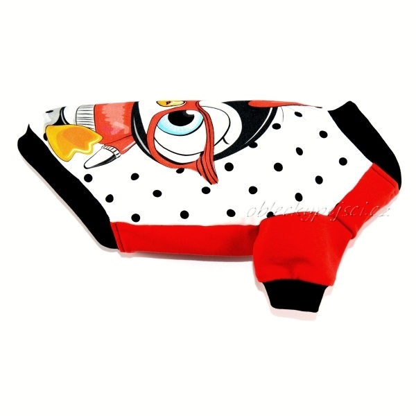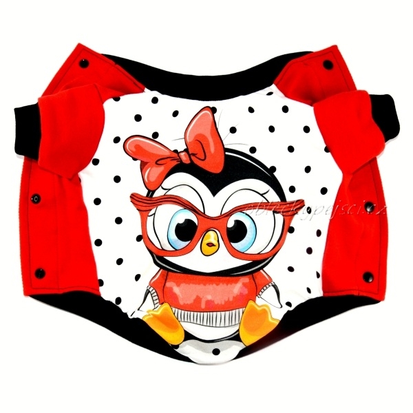 Mikina je ušitá z kvalitní, slabé, nepodčesané, elastické, červené teplákoviny s krásným, desingnovým teplákovým panelem s motivem roztomilého tučňáka s brýlemi.