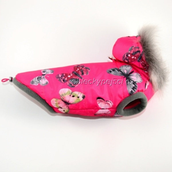 Zimní růžová bunda pro psí holky se šedo - stříbrnou kožešinkou na kapuci