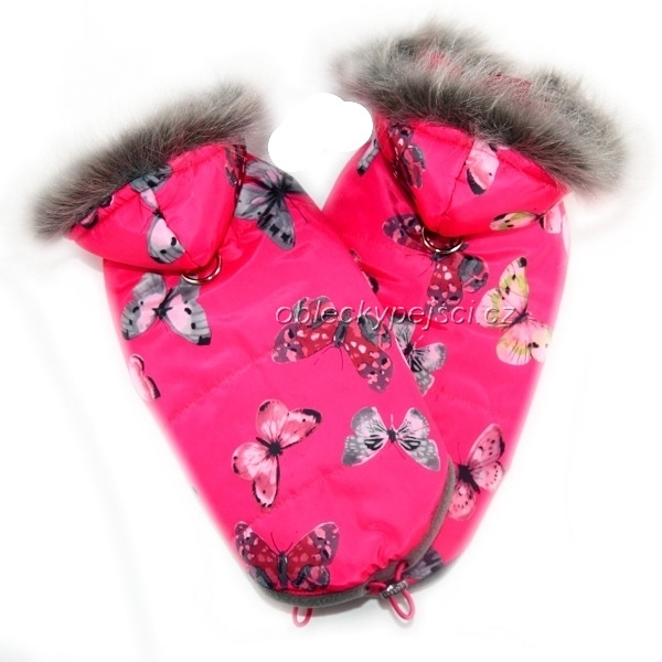 Bunda je ušitá z do jisté míry nepromokavého, růžového šusťákového proševu s motivem barevných motýlků, uvnitř vatelín a vypodšívkovaná hřejivým, měkkým, kvalitním, růžovým fleecem.