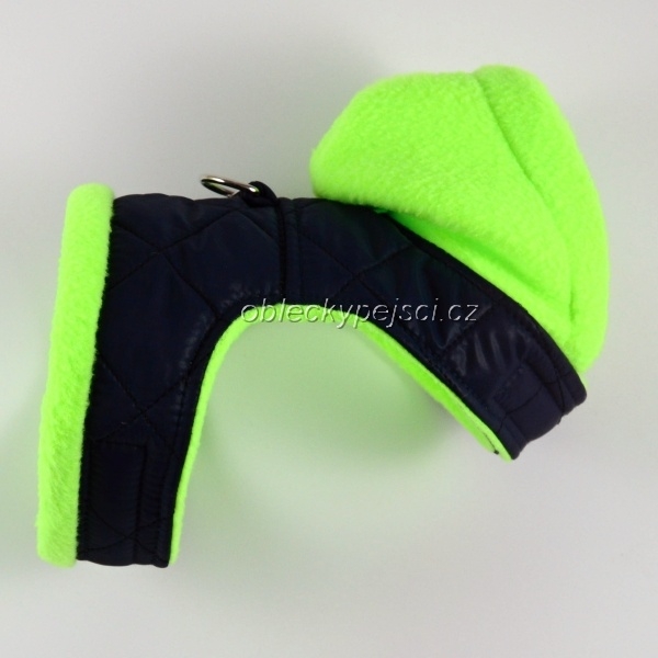 Kšíry jsou ušité z tmavě modrého, měkkého proševu, podšité fosforově zeleným fleecem, ze kterého je i všitá malá kapuce, která slouží pouze desingnově.