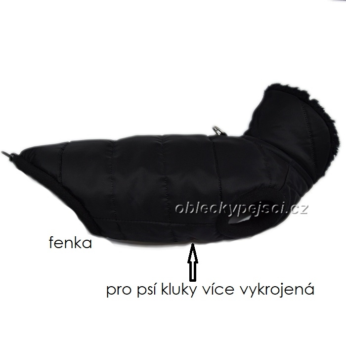 Bunda se zapíná na bříšku pomocí druků, v délce je protažená gumička na stažení. Nechybí opět polokroužek pro připnutí vodítka.