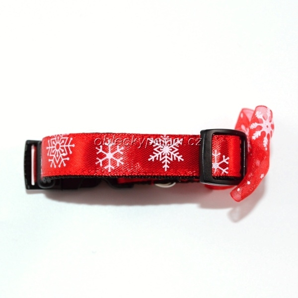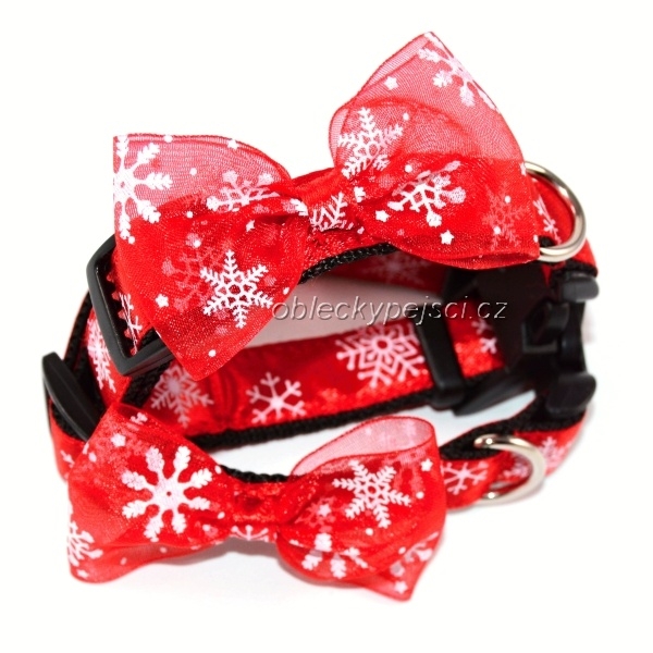 Obojek je ušitý z černého, polypropylenového popruhu s našitou červenou, saténovou stuhou s potiskem bílých vloček. Obojek zdobí přišitá malá monofilová mašlička rovněž červené barvy s bílými vločkami.