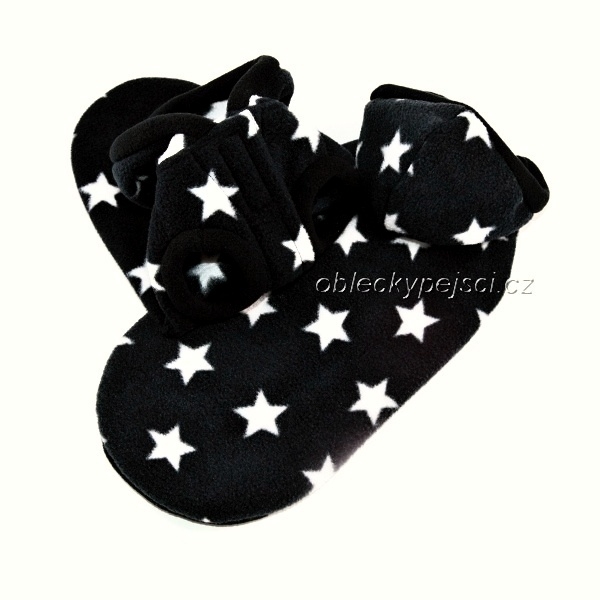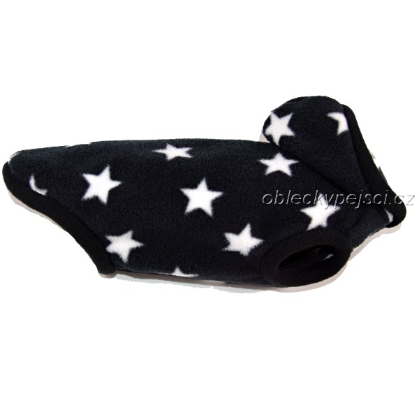 Mikina je ušitá z kvalitního, měkkého, silného černo - šedého fleece s motivem bílých hvězdiček. Pod kapucí je otvor pro připnutí vodítka a připevněna patentka, aby kapuce držela na svém místě.