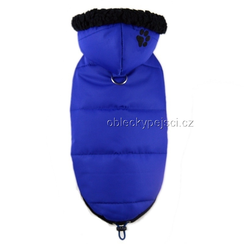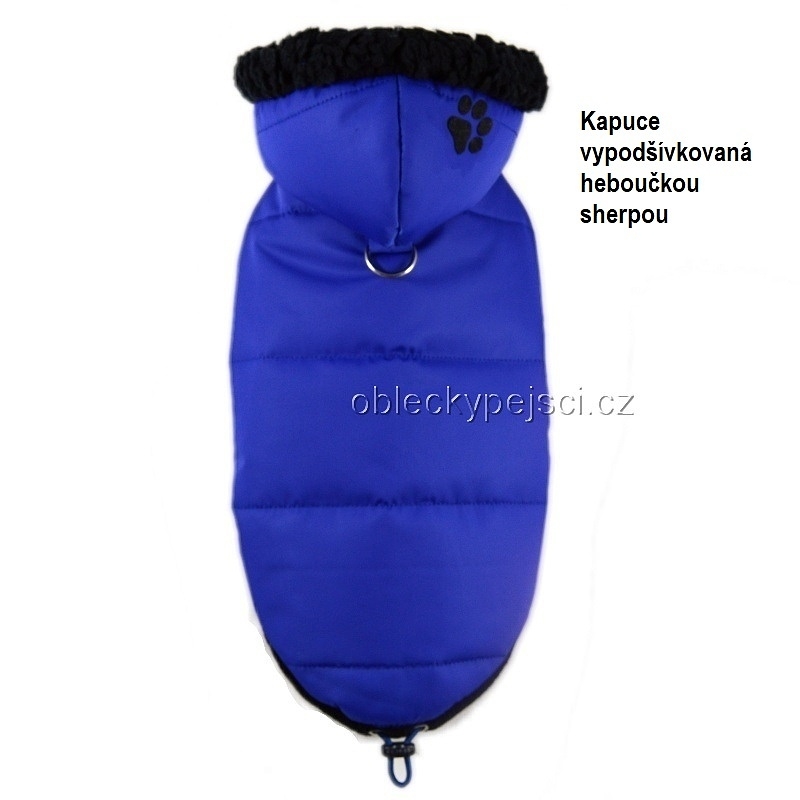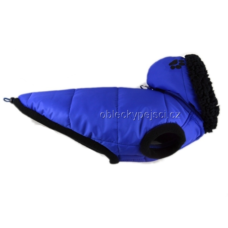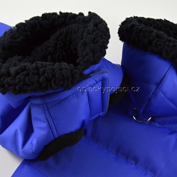 Kobaltově modrá bunda je ušitá ze šusťákového, měkkého, teplého proševu, který je do jisté míry nepromokavý, neprofoukne a je vypodšívkovaná modrým, teplým, kvalitním fleecem. Kapuca je vypodšívkovaná heboučkou černou sherpou a zdobí ji nažehlená černá tlapka. Pod kapucí je přišitý polokroužek pro připnutí vodítka a také patentka, aby kapuce při venčení pejska držela na svém místě.