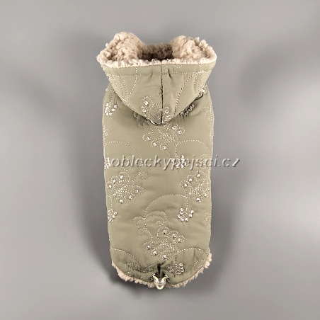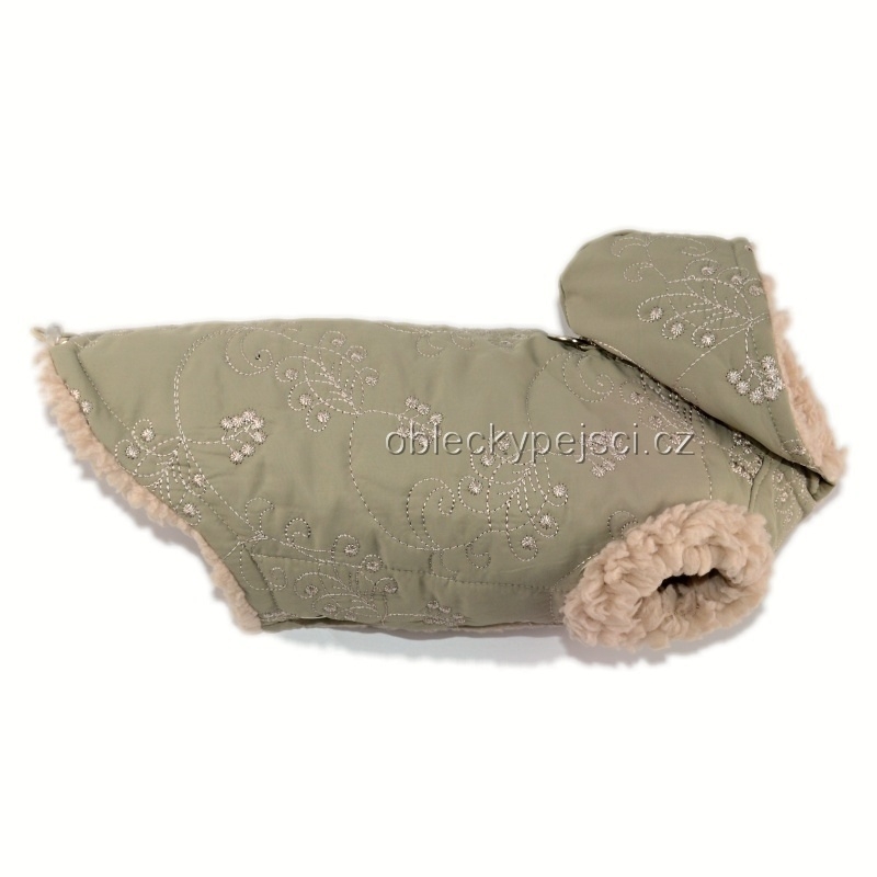 Bunda je ušitá z velmi příjemně měkkého, lehkého, vyšívaného, slabého proševu,(prošev není nepromokavý) vypodšívkovaná heboučkým, teplým béžovým beránkem.