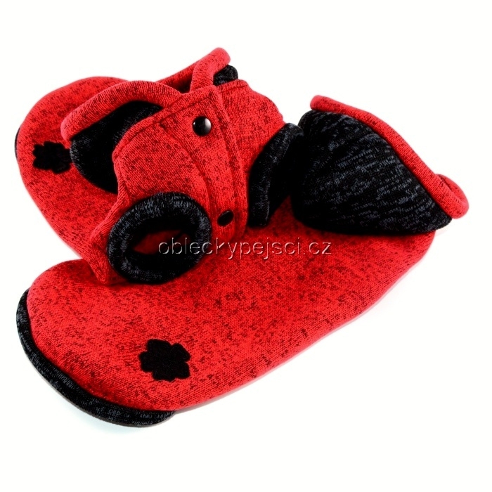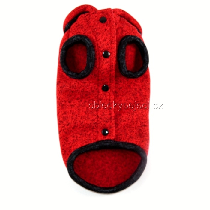 Teplý, tmavě červeno - černý melírový svetr s kapucí bez rukávů pro malé psí holky do zimních dnů.