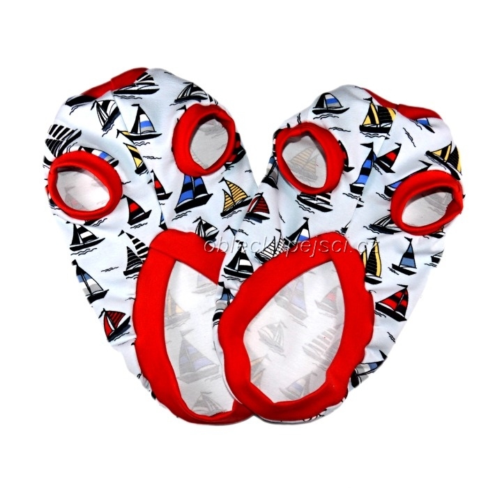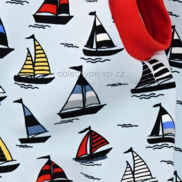 Tričko pro psí kluky s plachetnicemi je ušité z velice příjemného, bavlněného, elastického, světlonce modrého úpletu s motivem malých, barevných plachetnic.