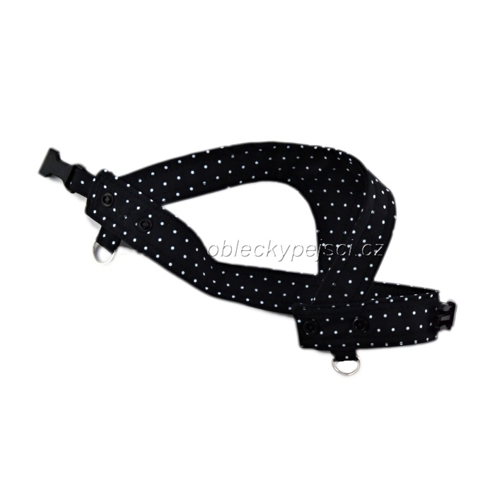 Krásné, puntikaté kšíry jsou ušité z letního softshellu s jednoduchým zapínáním na zádech pomocí druků a trojzubce.