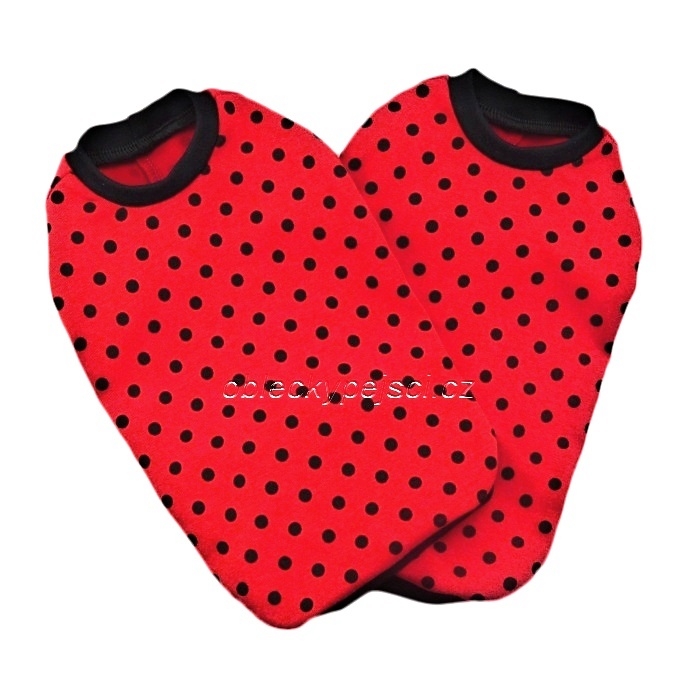 je ušité z červeného příjemného, bavlněného, slabšího úpletu s elastanem s potiskem malých, černých puntíků.