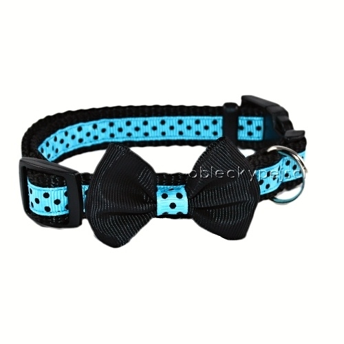 Obojek je ušitý z pevného, kvalitního, polypropylenového popruhu s tyrkysově modrou rypsovou stuhou s puntíky.