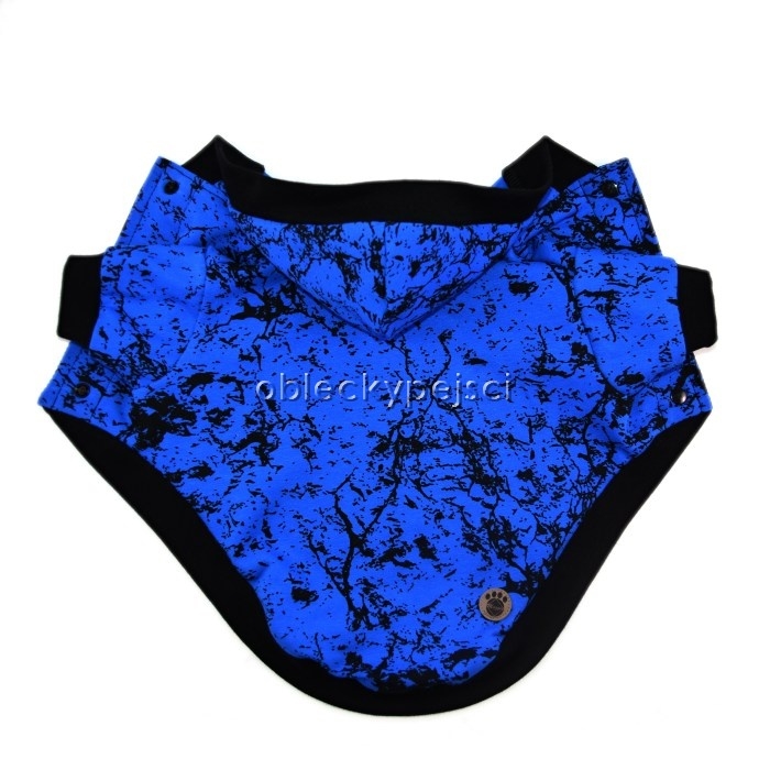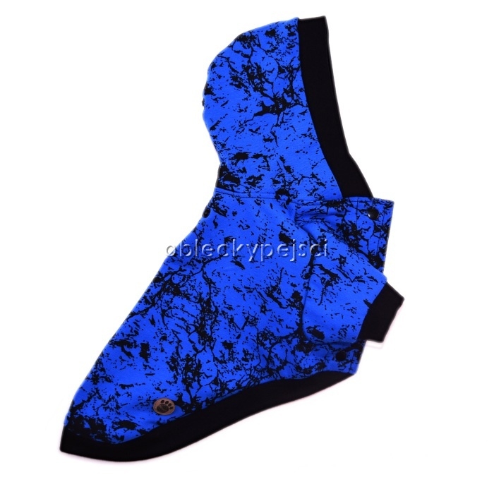 Výrazná, královsky modrá, tepláková mikina pro psy kluky s černým mramorovým motivem do jarních až podzimních dnů.