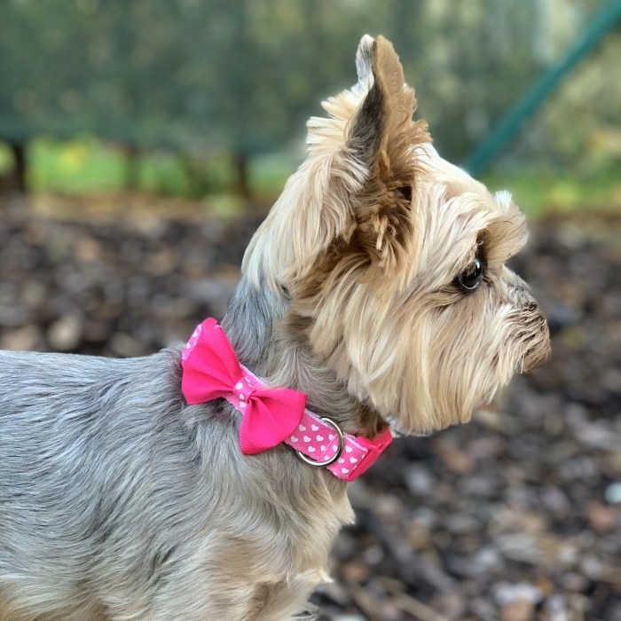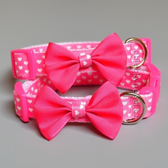 Obojek růžový s bílými srdíčky a růžovou mašličkou