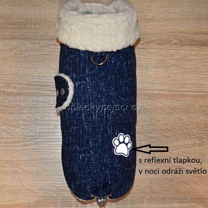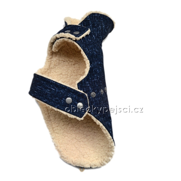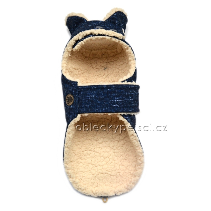 - ušitá je ze zimního modrého softshellu, který je voděodolný a přesto prodyšný, podšitá kvalitním, hebkým a teplým smetanovým beránkem