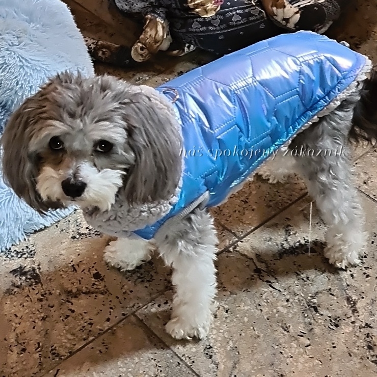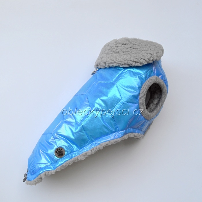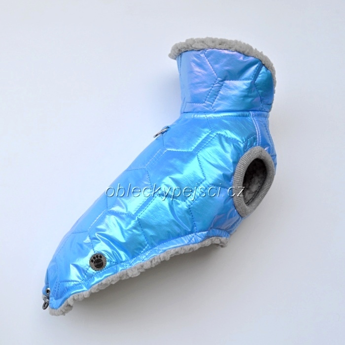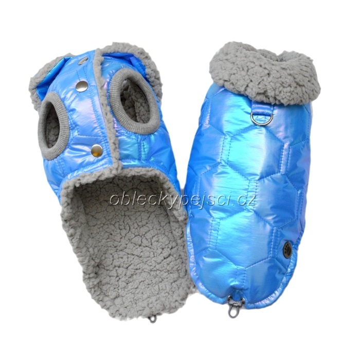 Zimní bunda pro malé psí kluky modrá s duhovými odlesky podšitá velmi heboučkou, příjemnou sherpou